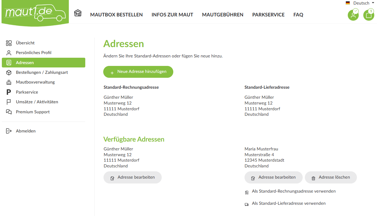 Bitte beachten Sie, dass Sie mehrere Adressen hinterlegen können, jedoch immer nur jeweils eine Adresse als Standard-Rechnungsadresse sowie Standard-Lieferadresse eingestellt sein kann.