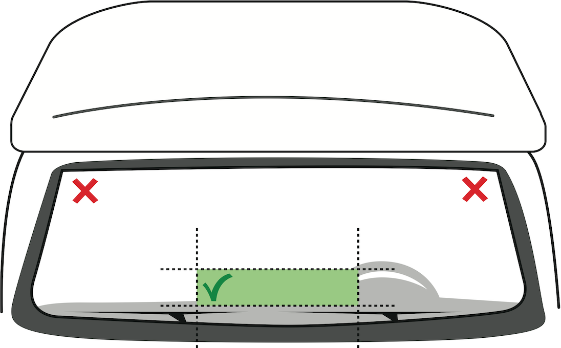 Bij campers, met name die met een alkoof, raden wij aan de badge in het midden, ongeveer 15 cm boven het dashboard, op de voorruit te bevestigen: